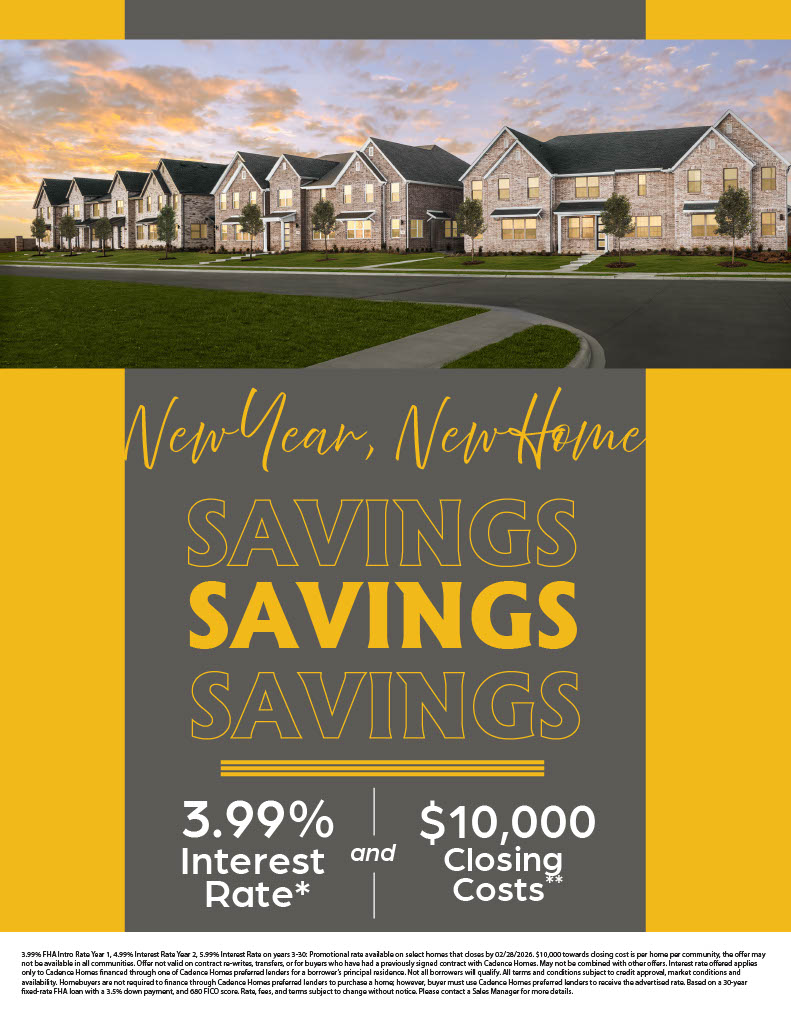 Cadence Homes is making it easier than ever to start the year in a new home with their New Year, New Home Savings Event. Enjoy 3.99% interest rates and $10,000 toward closing costs on select homes closing by February 28, 2026. It’s the perfect opportunity to make your move and start 2026 in a space designed for comfort, style, and connection.
