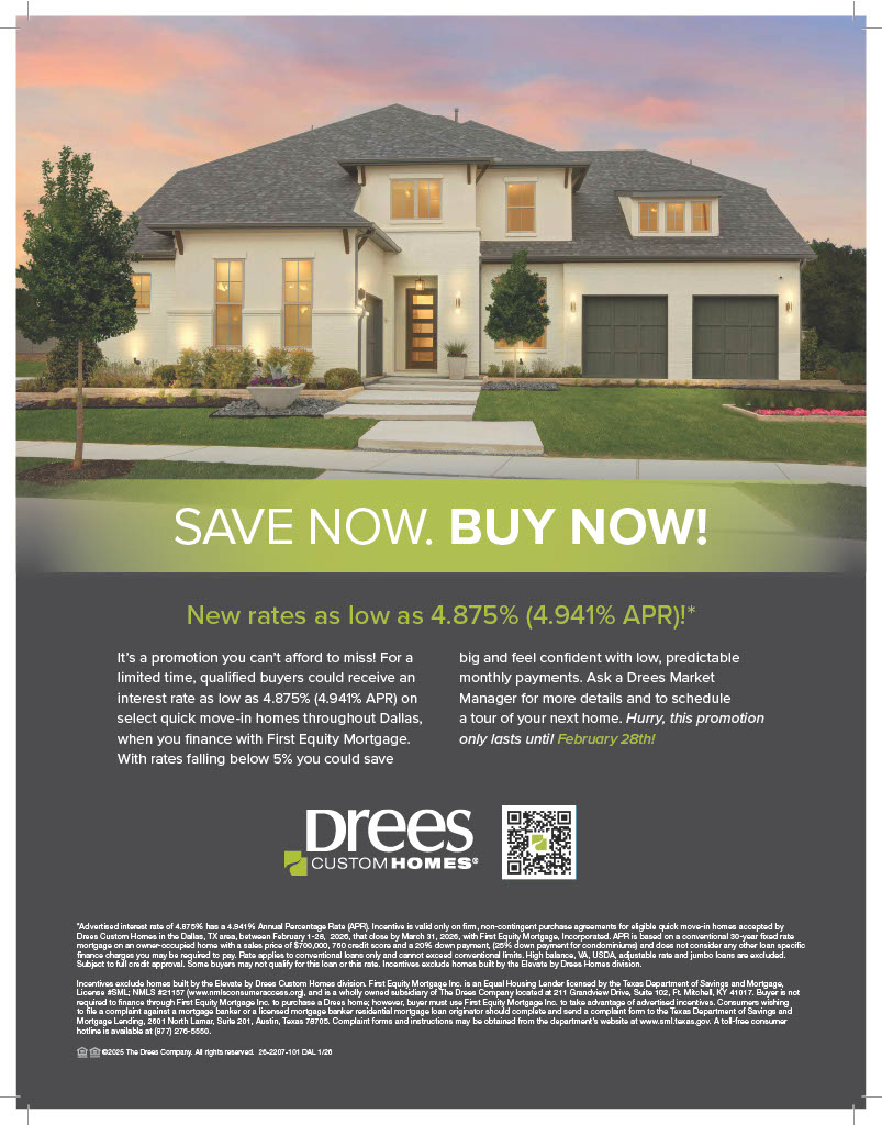 For a limited time, qualified buyers can take advantage of interest rates as low as 4.875% (4.941% APR*) on select Drees quick move-in homes throughout Dallas when financing with First Equity Mortgage.