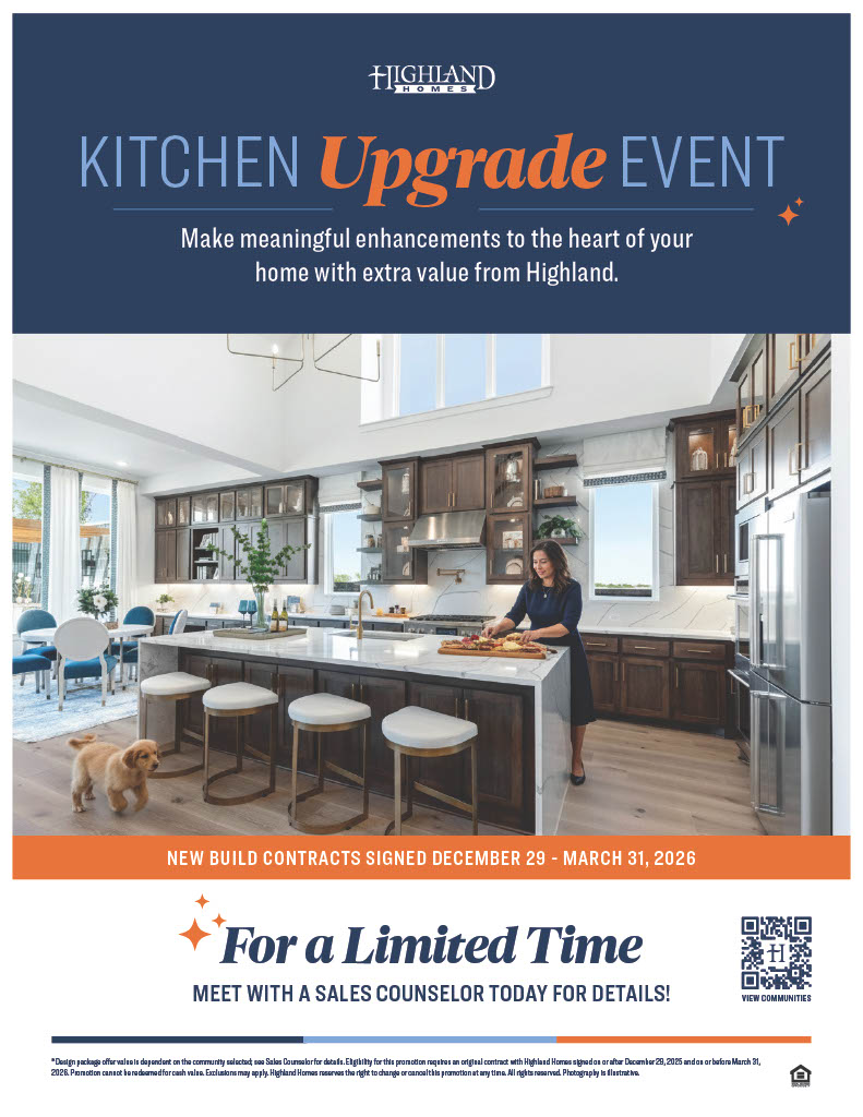 Start 2026 with more savings for what matters most! From January 1 – March 31, 2026, purchase any Highland home in the DFW area and receive $20,000 to put toward closing costs or buying down your rate.