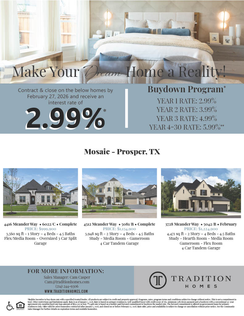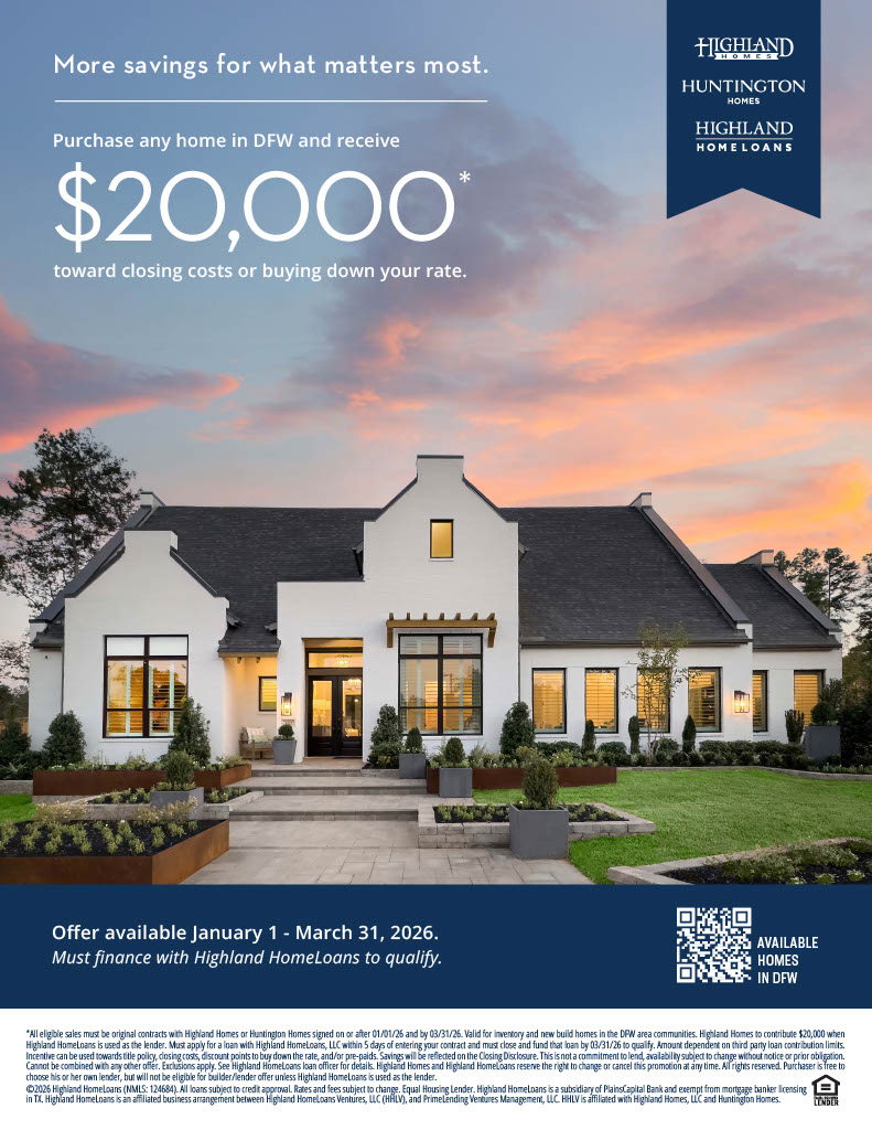 Start 2026 with more savings for what matters most! From January 1 – March 31, 2026, purchase any Highland home in the DFW area and receive $20,000 to put toward closing costs or buying down your rate.