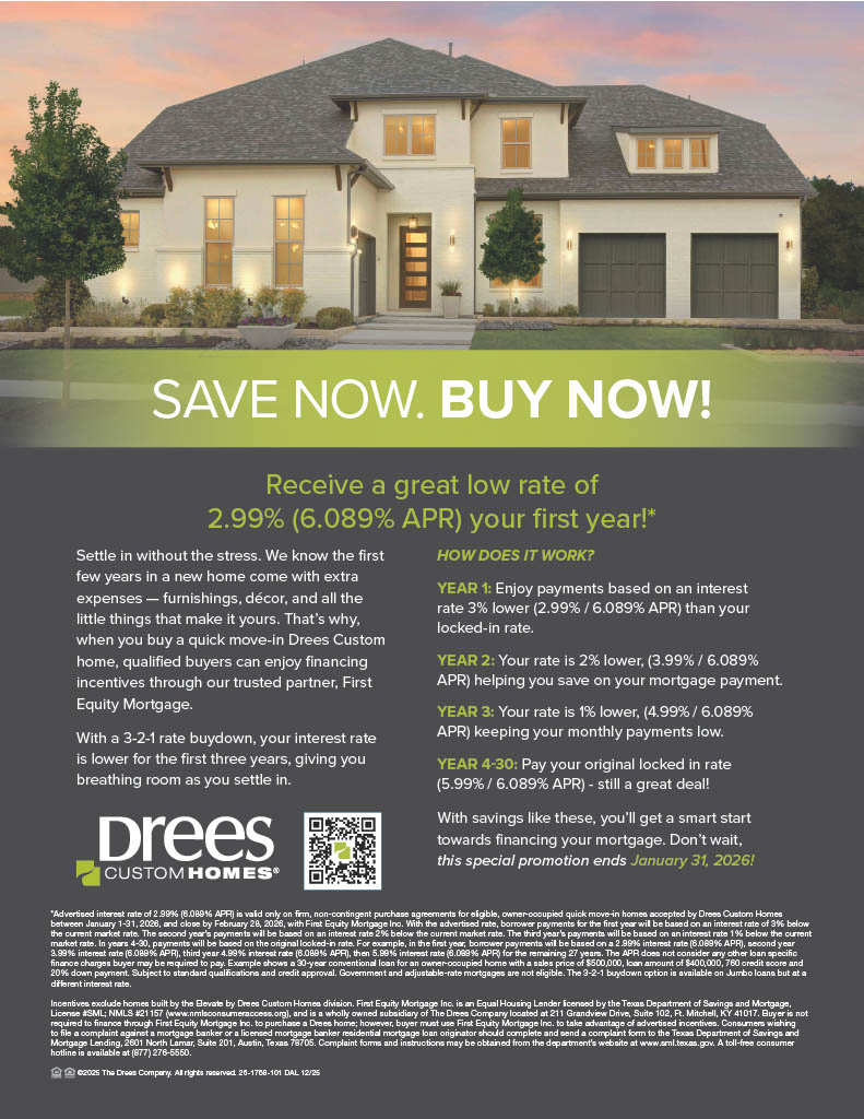 This January, Drees Homes is offering their Save Now. Buy Now! sales event on select quick move-in homes at Mosaic. Qualified buyers can enjoy a 3-2-1 rate buydown when financing through First Equity Mortgage, allowing for lower mortgage payments during the first three years of homeownership. With interest rates starting as low as 2.99% (6.089% APR) in the first year, this limited-time incentive helps make the transition into a new home more manageable. Offer ends January 31, 2026.