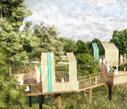 The Treehouse will feature an elevated observation tower for panoramic wildlife viewing, complete with interpretive signage educating visitors about local flora and fauna. The space includes climbing features like rock scrambles and rope ladders, offering playful challenges for all ages, and a pedestrian suspension bridge. Coming Fall 2026!